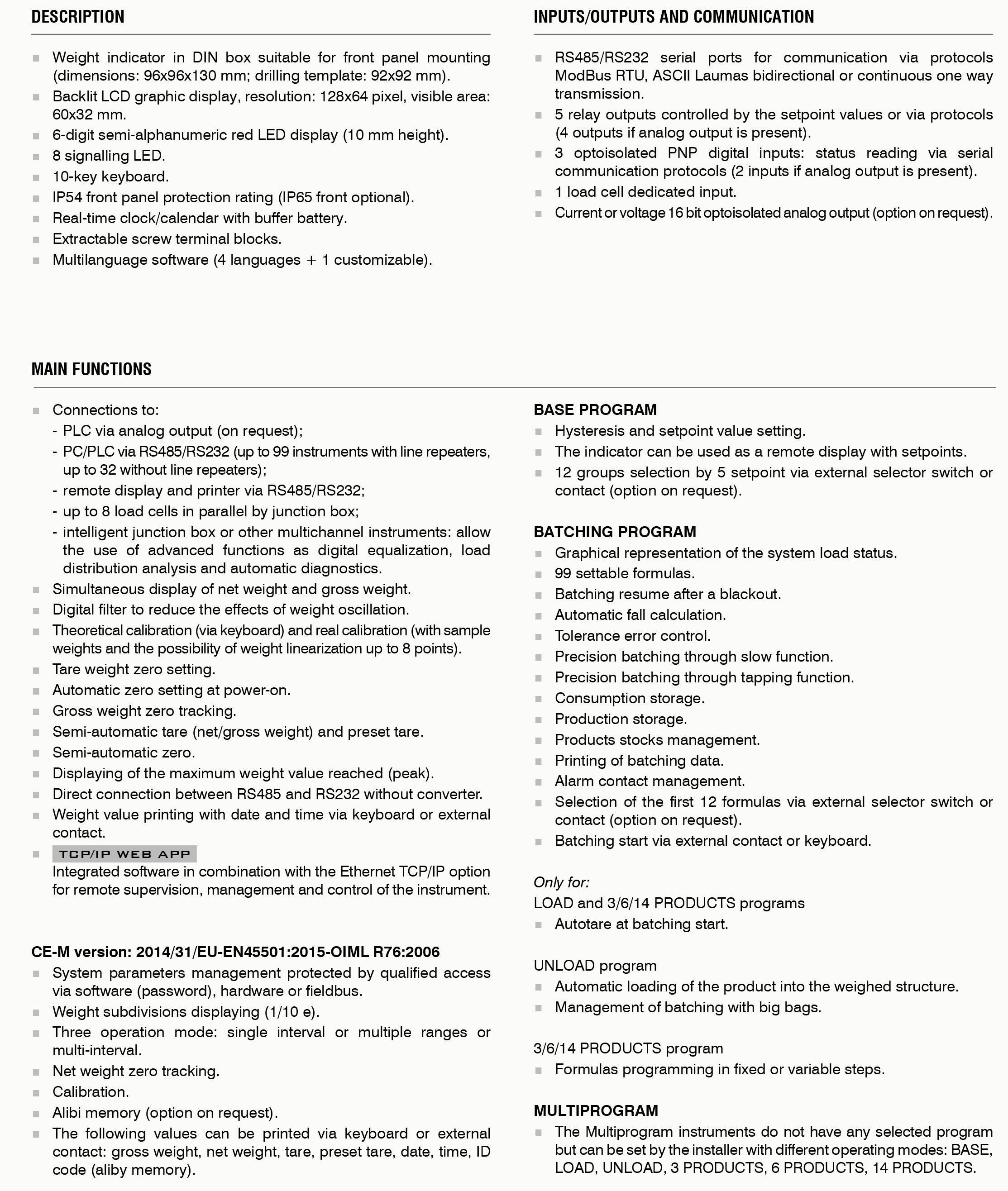 Weight Indicator in DIN case, dimensions 96 x 96 x 130 mm. IP54 front panel protection. Ten-key membrane keyboard. Eight indicator led. Real time clock/calendar.Panel mounting