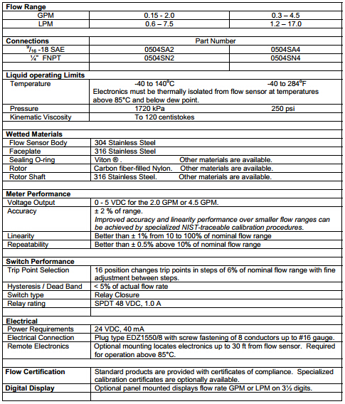 標準500系列計量流量開關校準與水約25°C / 77°F。使用其他液體比水的差異可能會影響測量的準確性粘度。普羅透斯的世界級的校準能力使我們有專門提供儀器溫度,fluid-specific校準。