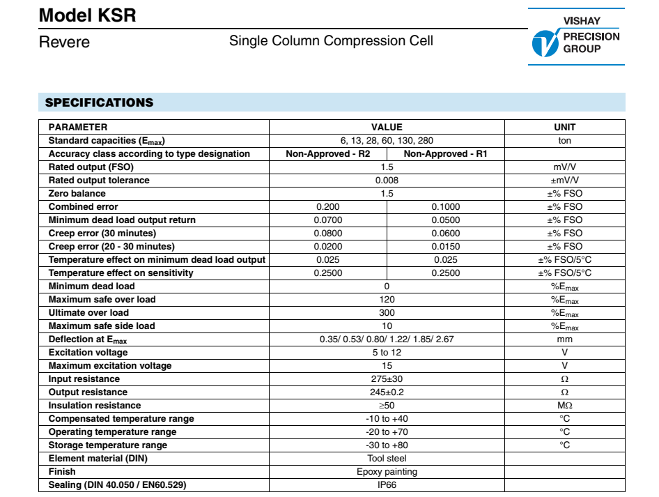 vishay Revere KSR-130t稱重傳感器型號類別技術參數選型安裝等資料信息,如果有關