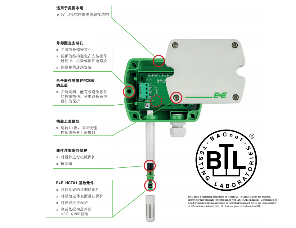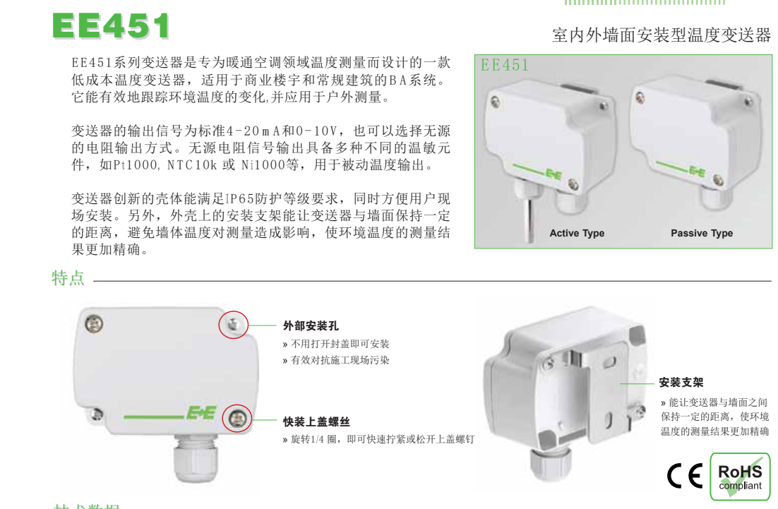 奧地利E+E全系列溫濕度傳感器,ee451系列溫濕度變送器是由奧地利益加義公司專為HVAC系統設計開發的全新系列產品。ee451系列變送器具有高精度、低成本的特性,是測量空氣相對濕度和溫度的理想儀表,能為用戶提供可靠的溫濕度測量解決方案。優秀的品質及全新設計的產品外殼,最大程度地降低了安裝成本,減少了現場的工作量,提升了產品抗污染、抗凝結的性能,從而保證其在工作過程中將誤差降低到最小程度。ee451系列產品采用了最新的E+E生產的HCT01敏感元件,具備更好的長期 ee451 穩定性和抗污能力。結合了多年的校準經驗,ee451的測量精度可以達到±2.5%RH,具有電流(mA)、電壓(V)和數字通訊三種信號輸出方式。現場安裝分為墻面安裝和風管安裝兩種方式。